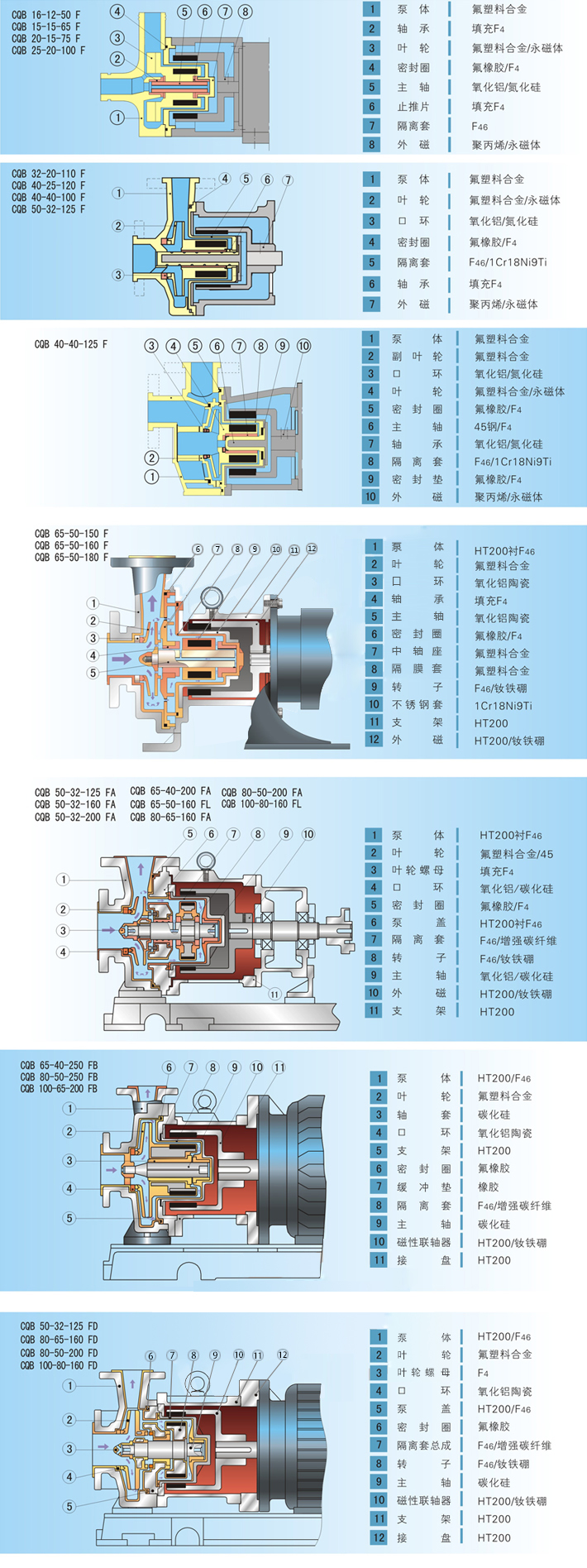 由于泵的过流部分选用“氟塑料合金”制造。可连续输送任意浓度的酸、碱、强氧化剂等腐蚀介质而毫不受损。